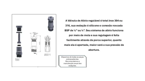 Válvula de alívio e pressão com regulagem de 1 a 8 bar.